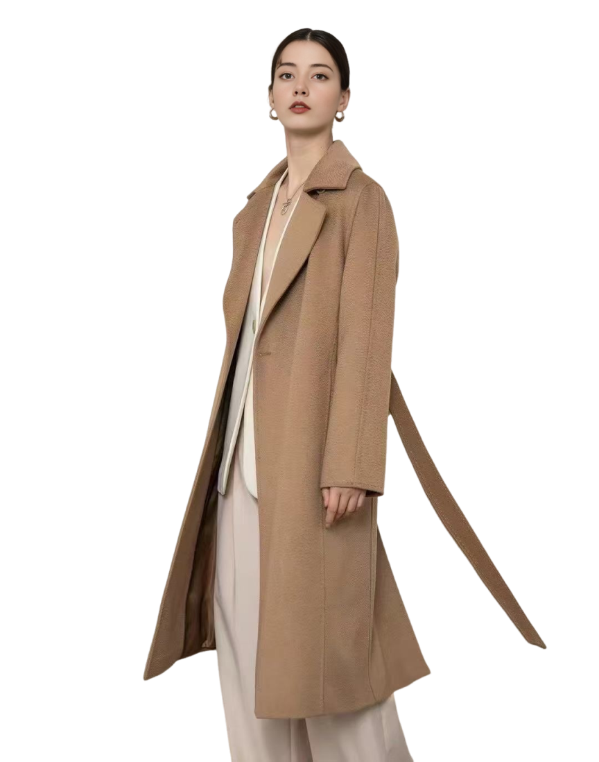 A relaxed longline coat crafted in camel-toned brushed wool cashmere. Featuring a soft-shouldered cut, classic lapels and a clean single-breasted front. The open silhouette flows with movement, enhanced by a lightweight mulberry silk lining. Wear it belted or draped open for an effortless finish.